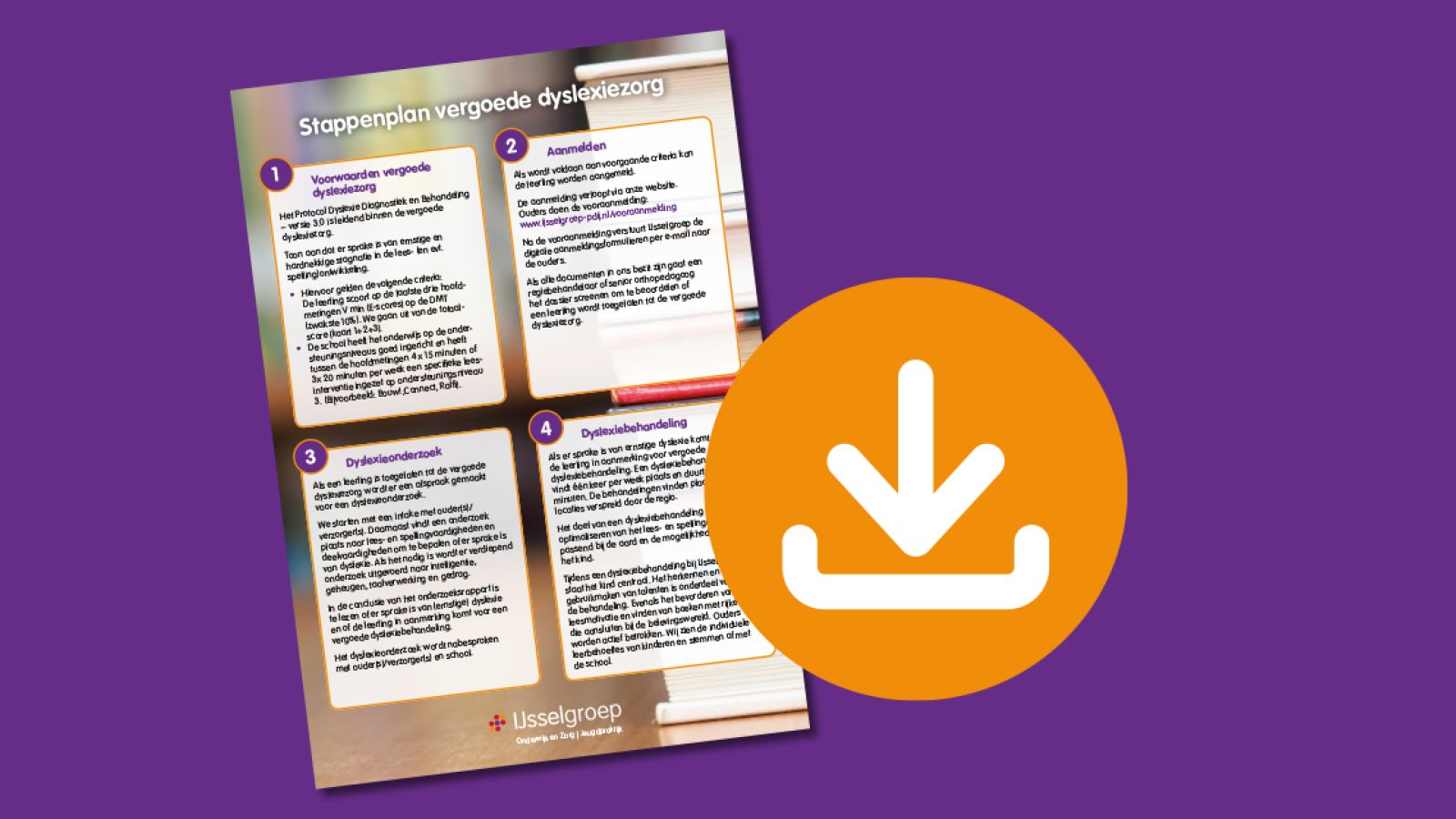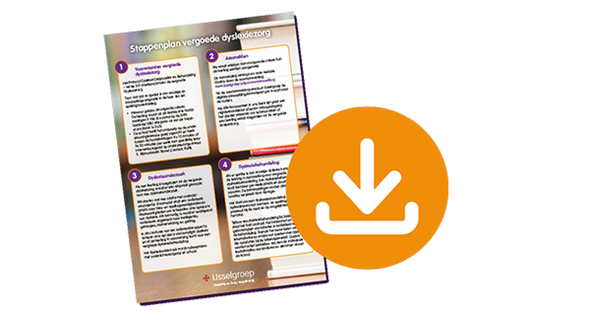 Hieronder vind je het document ‘Stappen vergoede dyslexiezorg’: een handige pdf met de criteria voor toelating tot de zorg en een korte uitwerking van de stappen van de vergoede dyslexiezorg binnen IJsselgroep.