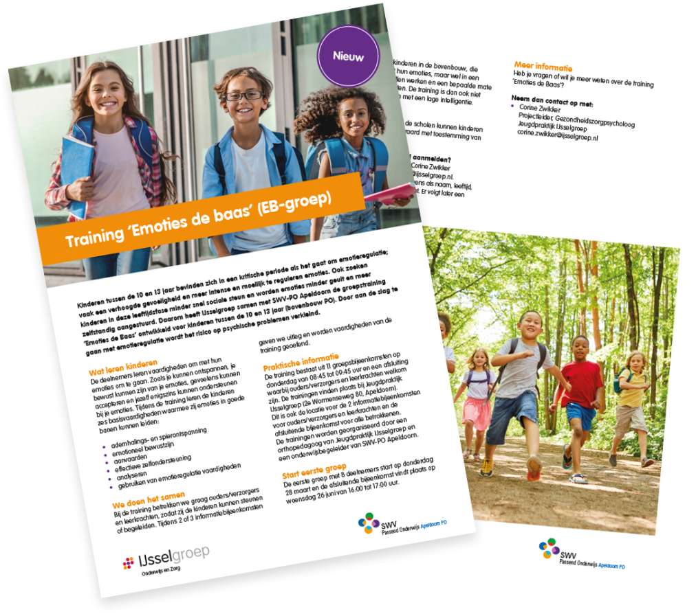 Een mooie samenwerking tussen SWV-PO Apeldoorn, CJG en Jeugdpraktijk IJsselgroep resulteert in een nieuwe groepstraining ‘Emoties de Baas’. De training is voor kinderen tussen de 10 en 13 jaar (bovenbouw) van alle PO scholen in Apeldoorn en is gericht op emotieregulatie. Hierdoor wordt het risico op psychische problemen verkleind. Gesprekken met ouders en leerkrachten maken onderdeel uit van de ‘Emoties de Baas’. Want we doen het samen.